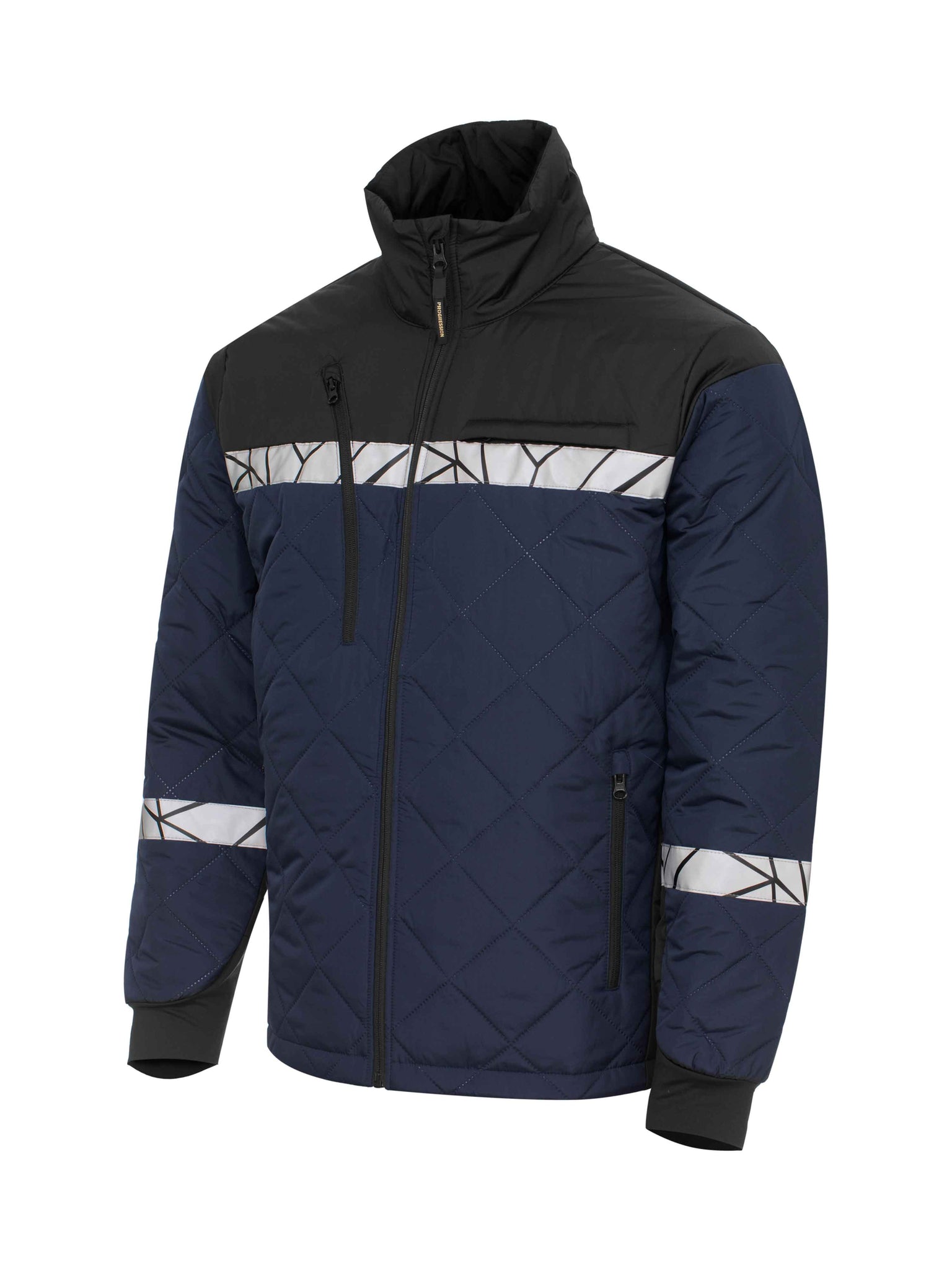 Jacke aus leichtem, nahtlosem Rautenmuster-Steppstoff. Brusttaschen auf beiden Seiten mit Reissverschluss, auf der linken Seite mit innenliegender Halterung zur Befestigung einer ID-Karte. Seitentaschen auf beiden Seiten mit Reissverschluss, zudem offene Innentaschen für Dokumente usw. Waschetikettentasche in der inneren linken Seitennaht.