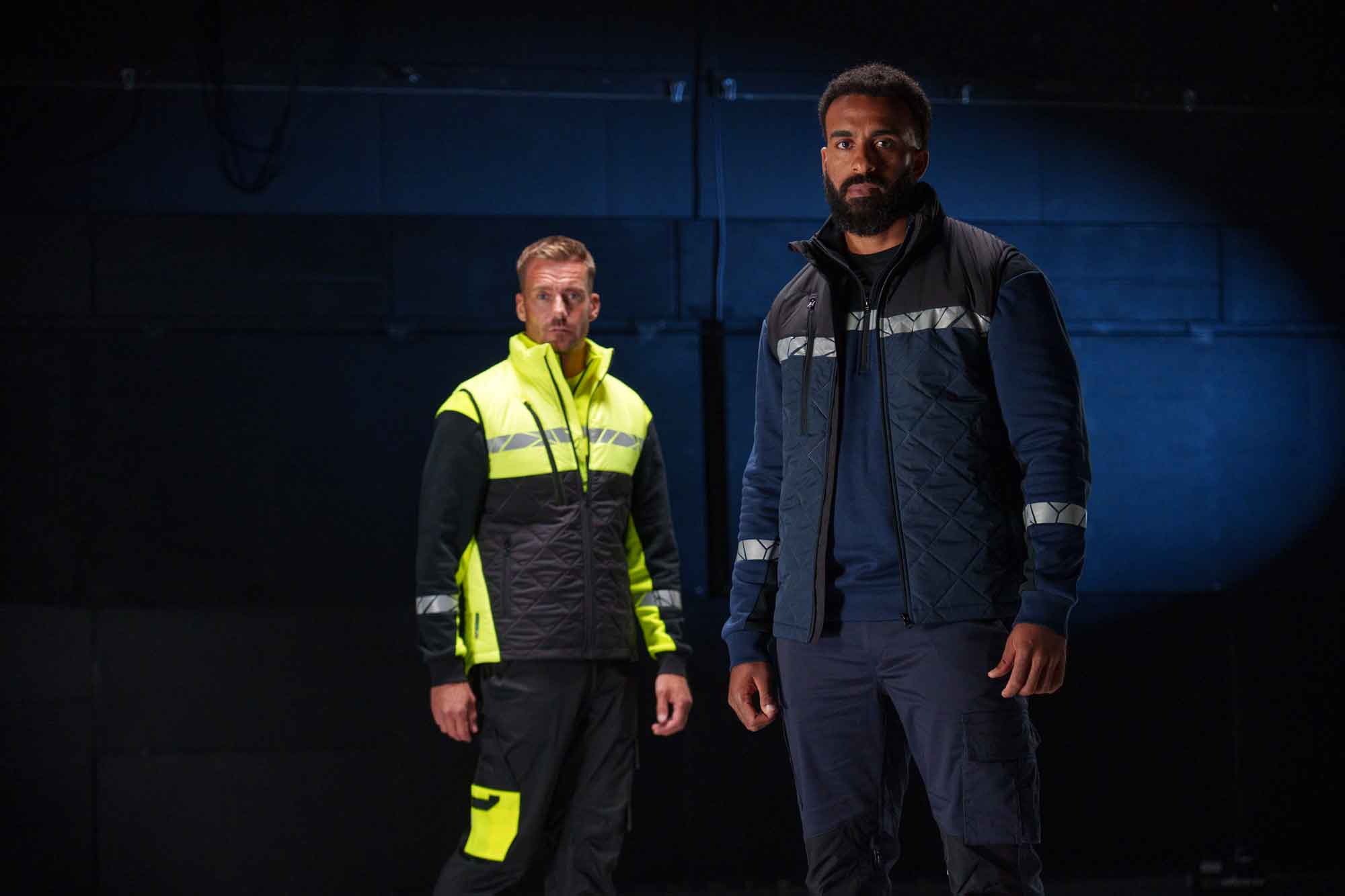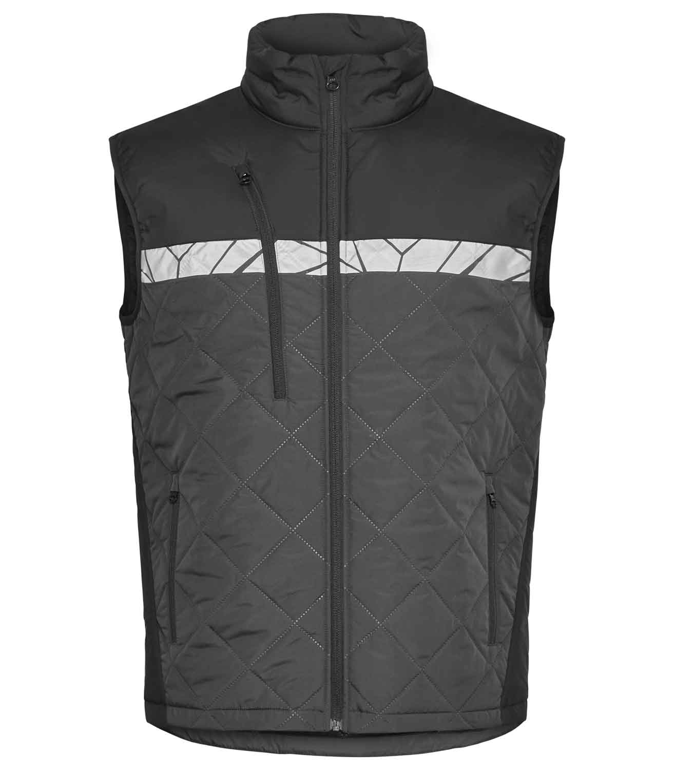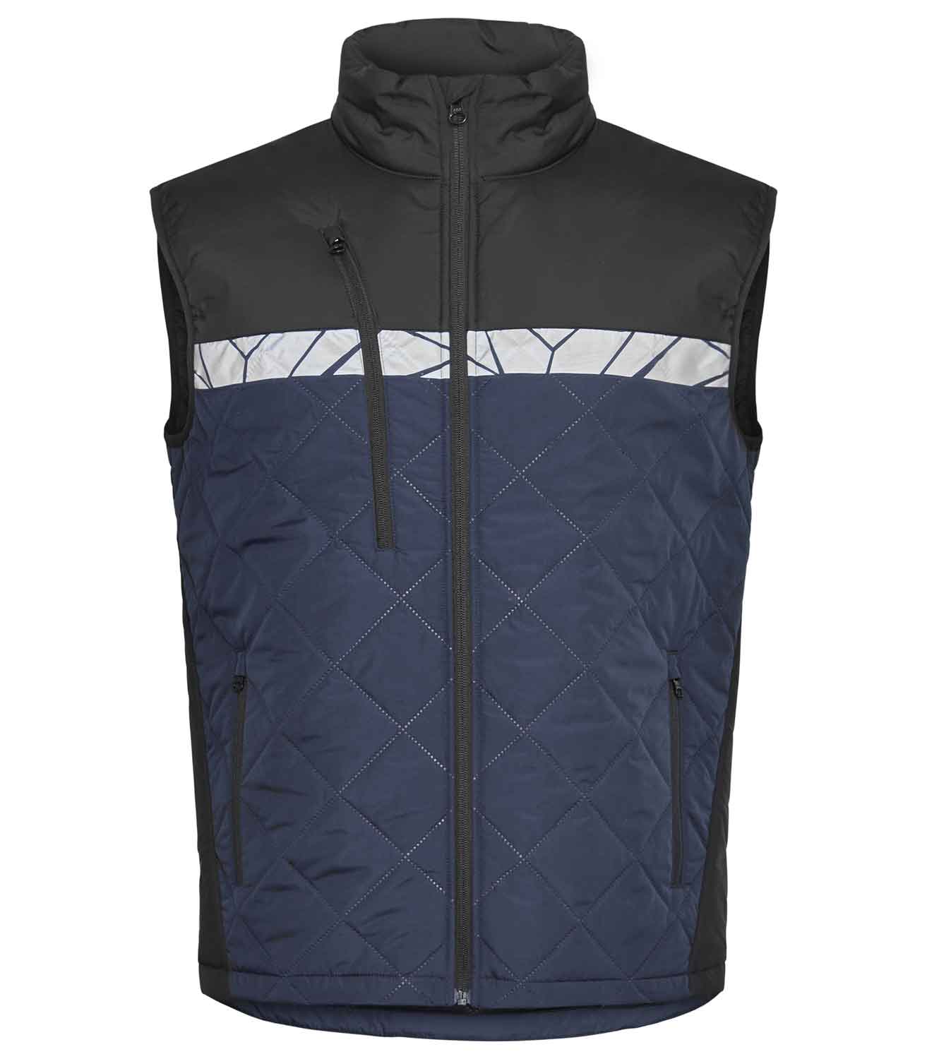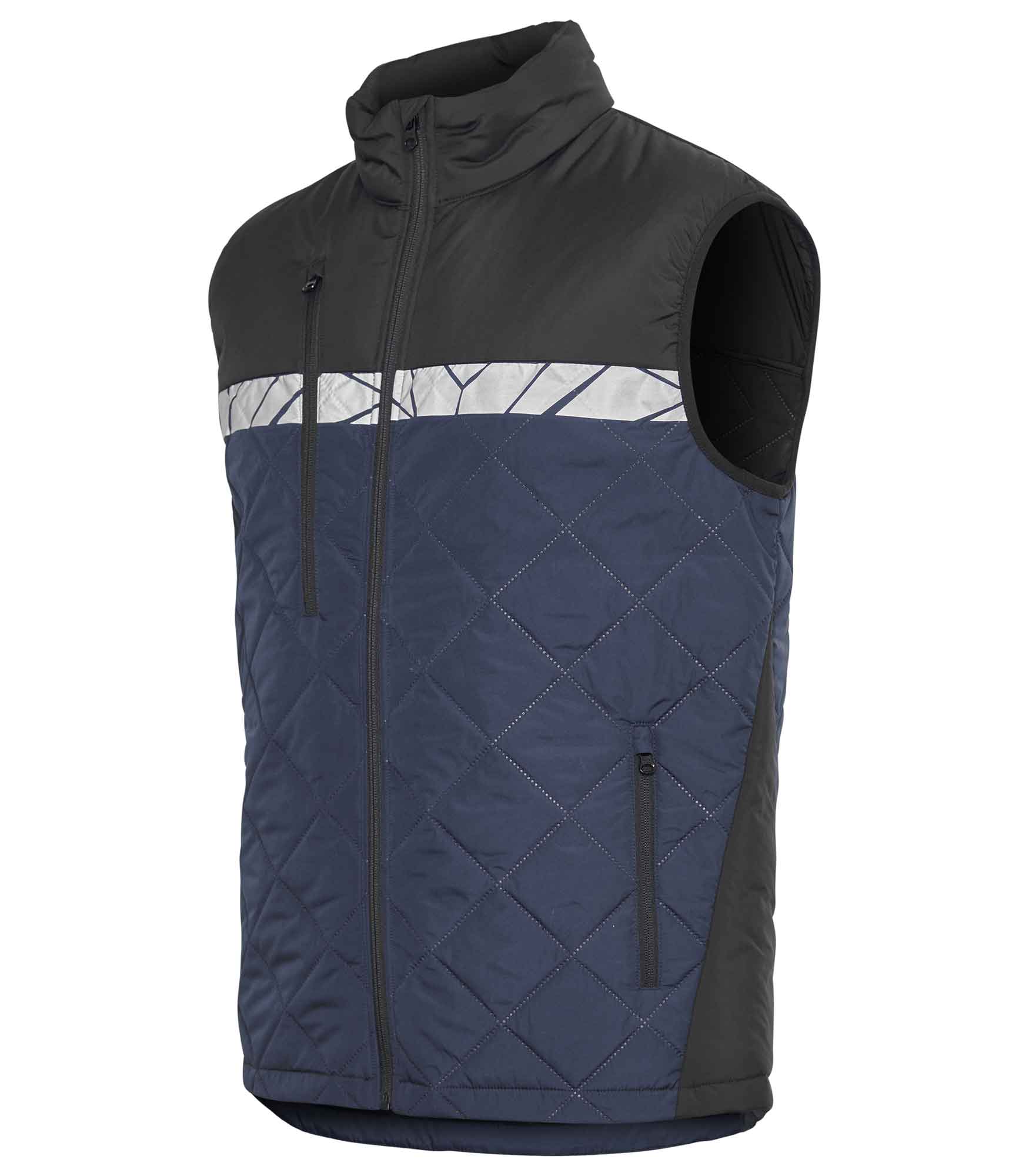 Leichte Weste aus nahtlosem, diamantgestepptem Material. Brusttasche auf der rechten Seite mit Reissverschluss, ausserdem eine innere Halterung zum Befestigen eines Ausweises. Seitentaschen auf beiden Seiten mit Reissverschluss. Wäschechip-Tasche in der linken inneren Seitennaht. • Geliefert in einem biobasierten, kompostierbaren Beutel