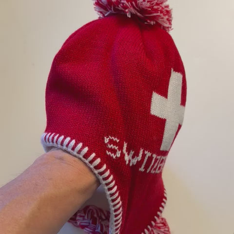 Warme Wintermütze mit Schweizerkreut und Switzerland, inkl. Ohrenschutz und Kordel aus Acryl.