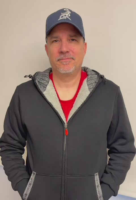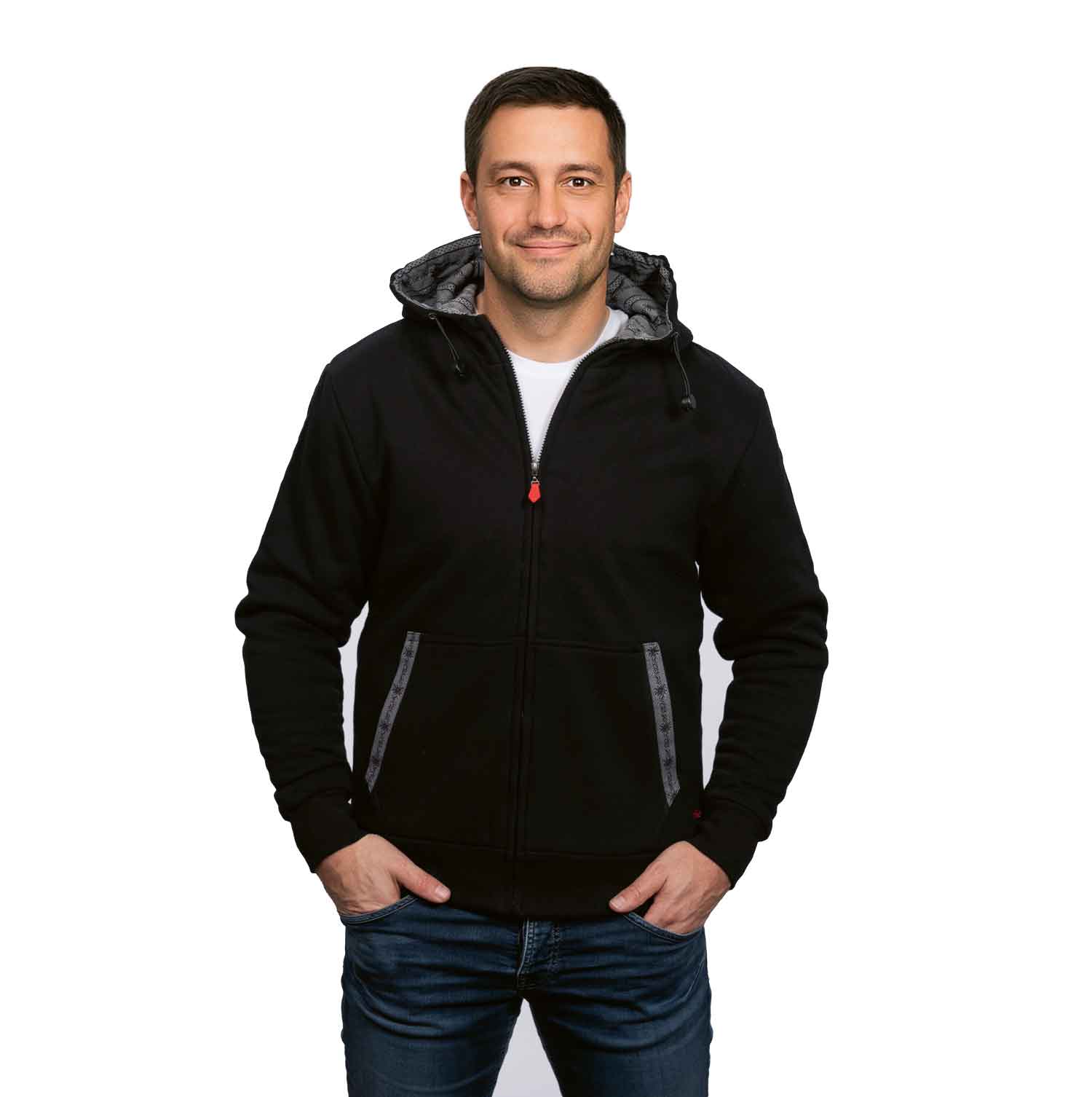 Schwarze, hochwertige Kapuzenjacke von efbe mit weichem Microfleece an der Innenseite, Frontreissverschluss, hochgeschnittener Kapuze mit Kordel und hochwertigen Metallösen. Veredelt mit einem Band aus Edelweiss in den Farben Anthrazit, Edelweiss Mode vom Feinsten.