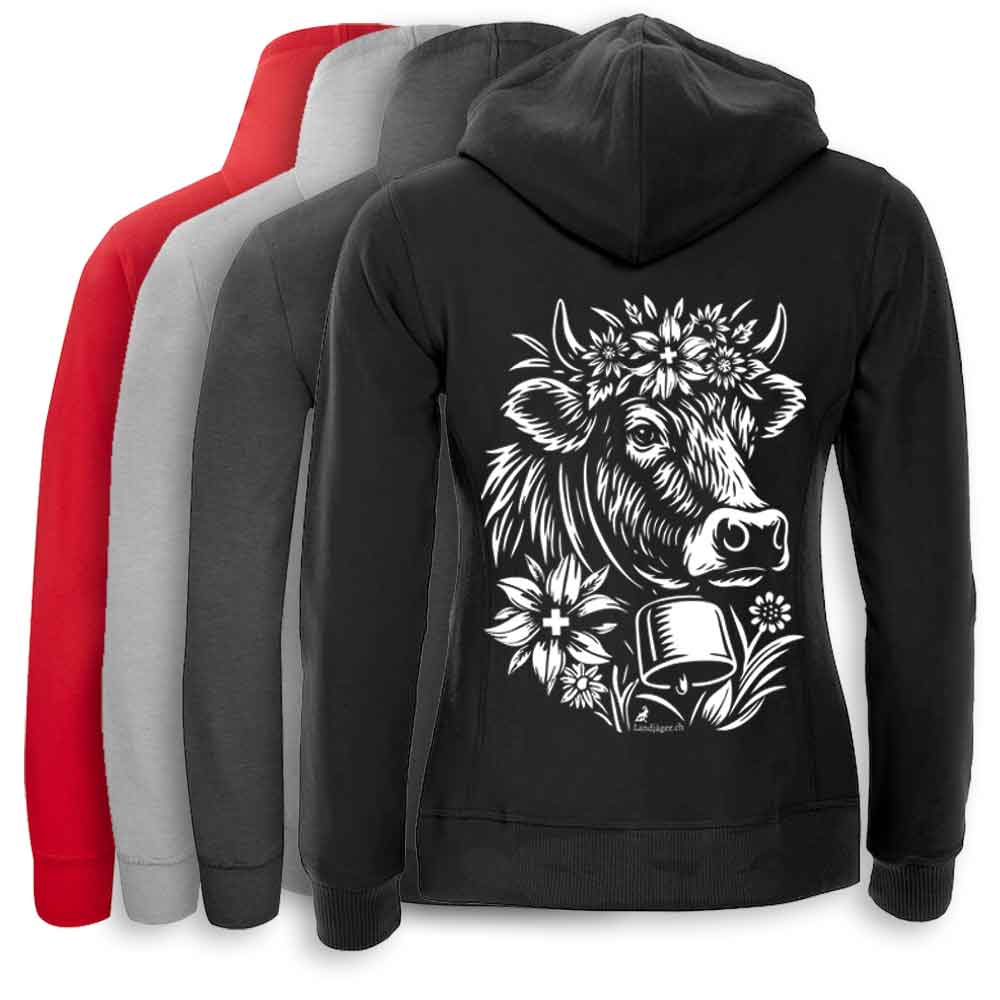 Kapuzenjacke Damenschnitt (Bilder dienen nur als Referenz) veredelt mit einem Schweizer Schwarznasenschaf, stolz und prächtig.
