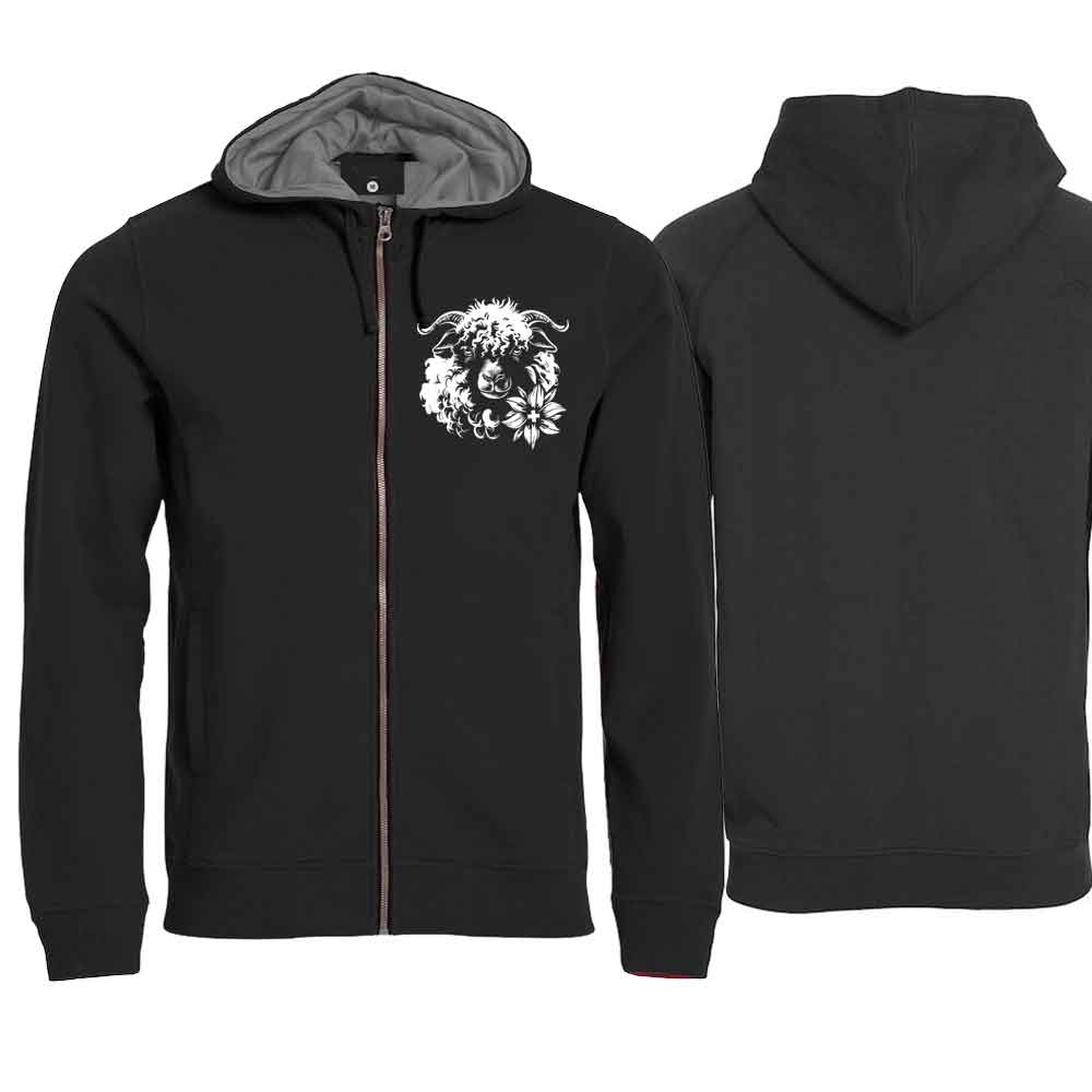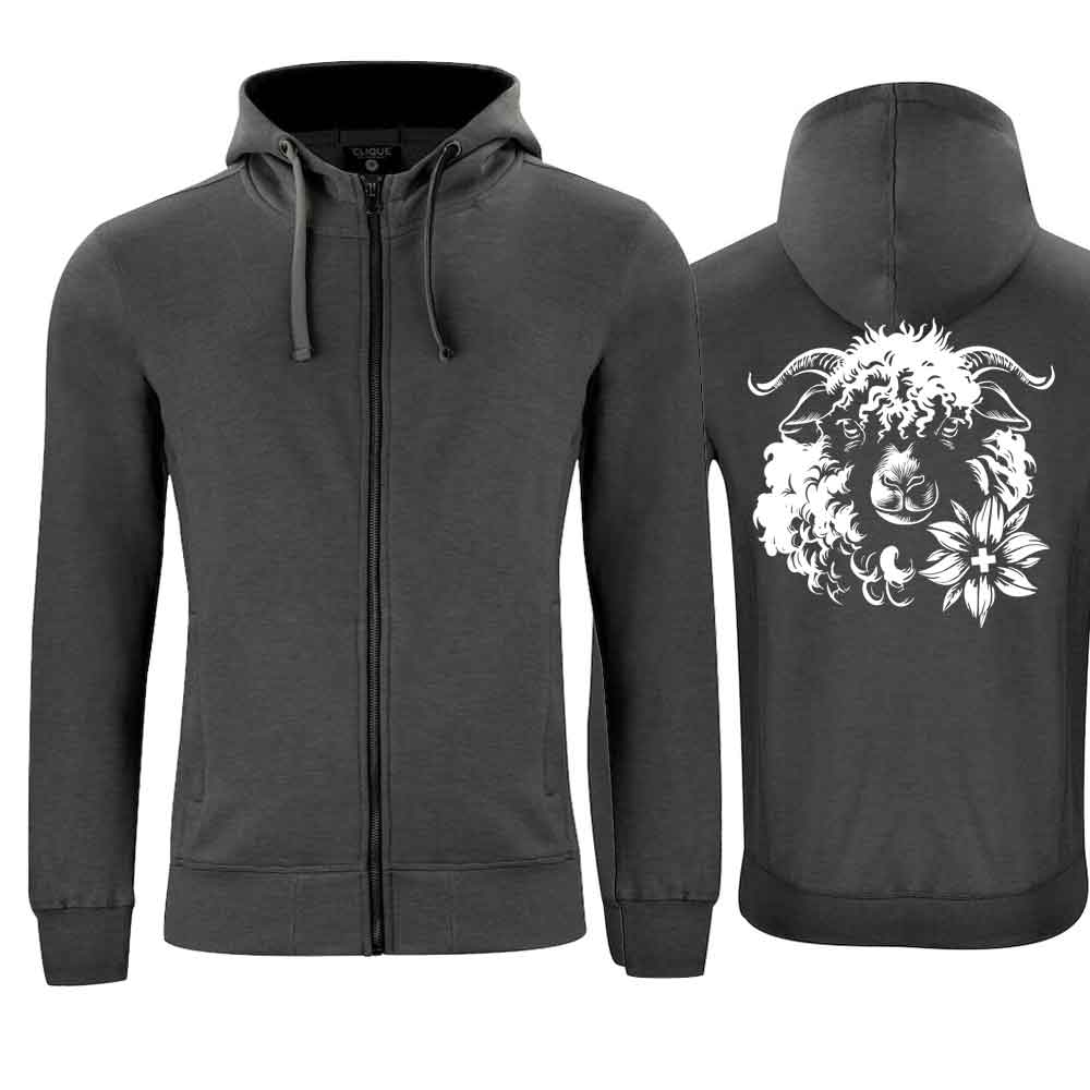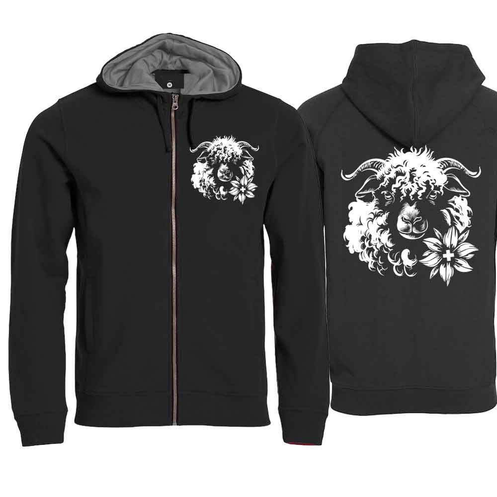 Kapuzenjacke veredelt mit einem Schweizer Schwarznasenschaf, stolz und prächtig.