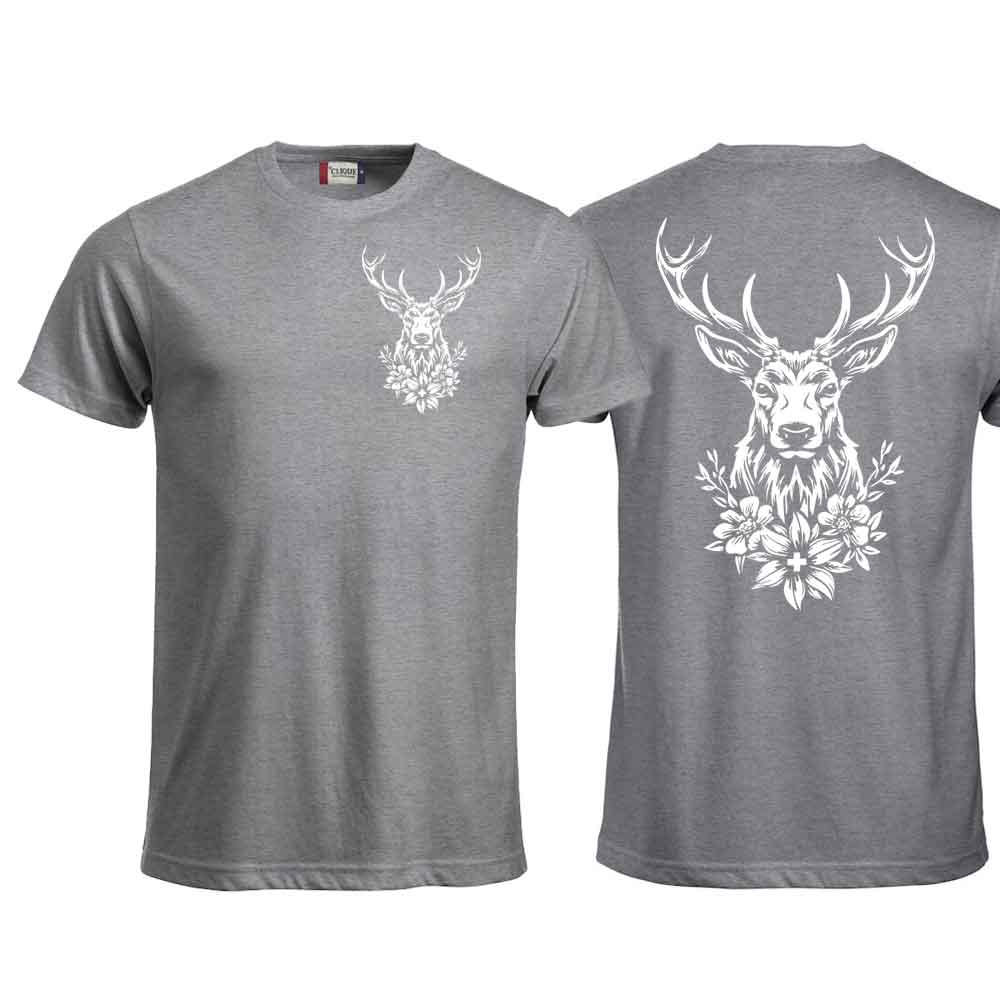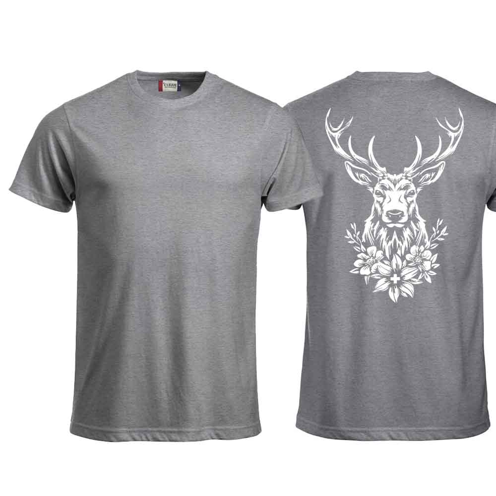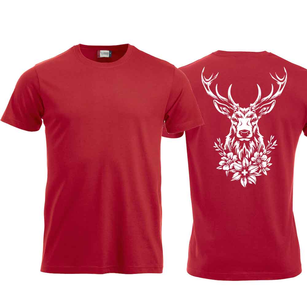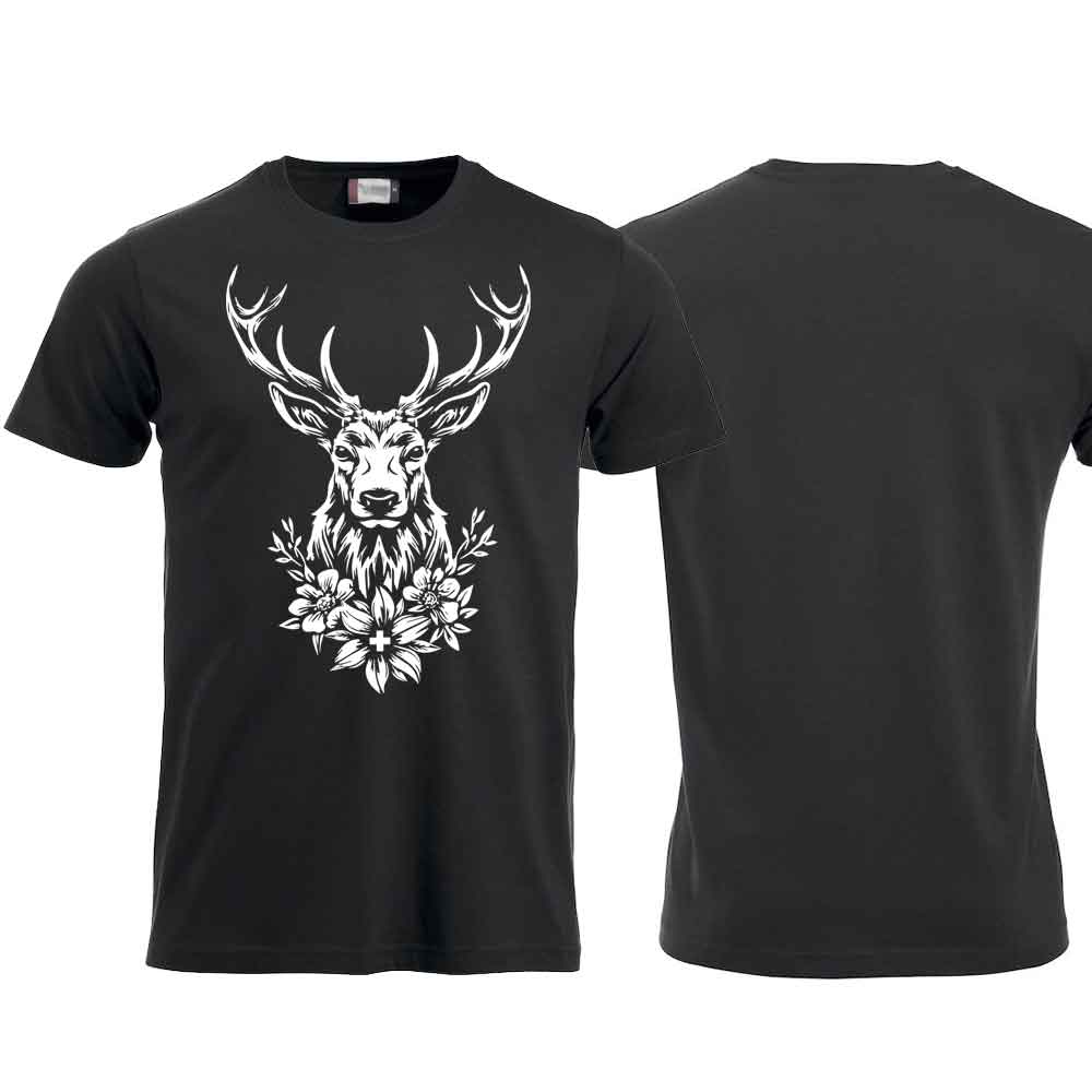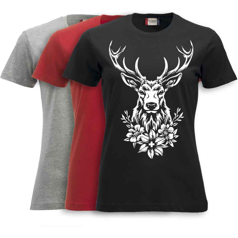 Damen T-Shirt veredelt mit einer Schweizer Hirsch, stolz und prächtig.