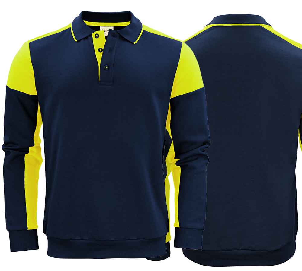 Activwear - two-tone polo sweater with contrasting stripes on the collar. Contrast tape on the neck. 2x2 ribbed cuffs and hem. There is a pocket in the inside left side seam for sewing in a laundry chip. Oeko-Tex 100 certified. Compostable packaging.