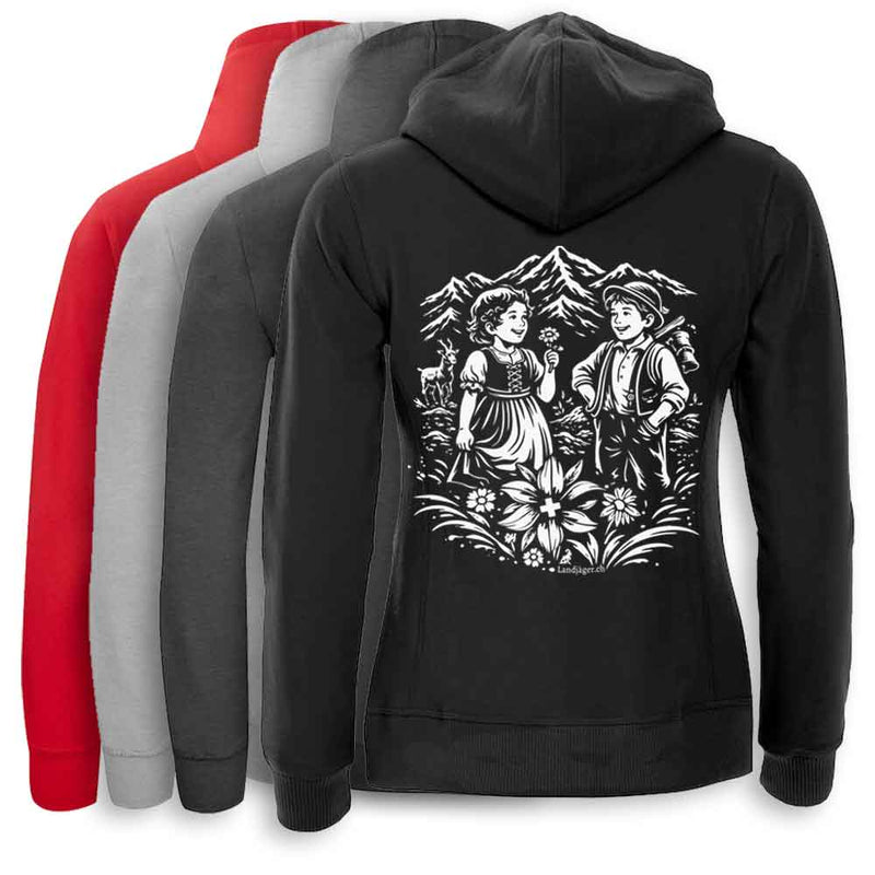 Veste à capuche Coupe féminine (les images servent uniquement de référence) affinée avec un poisson (truite) dans le Swissnesslook, fier et magnifique. Disponible exclusivement ici.