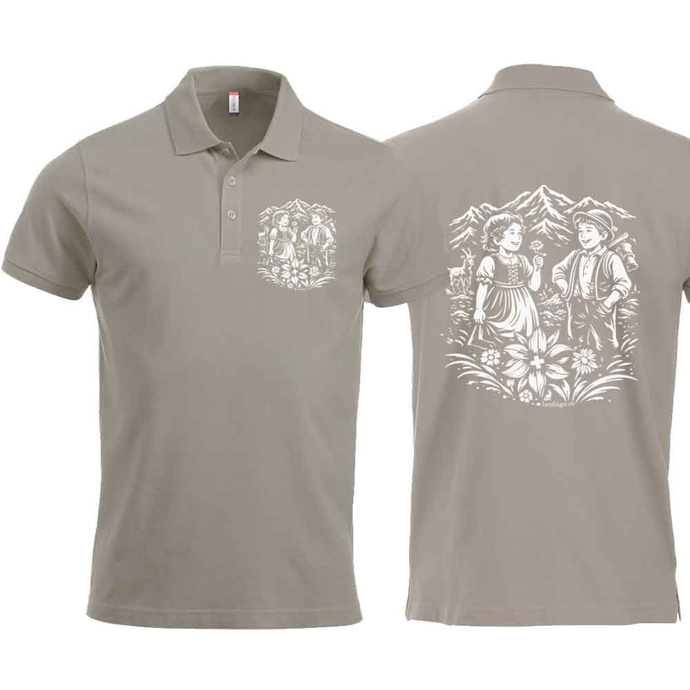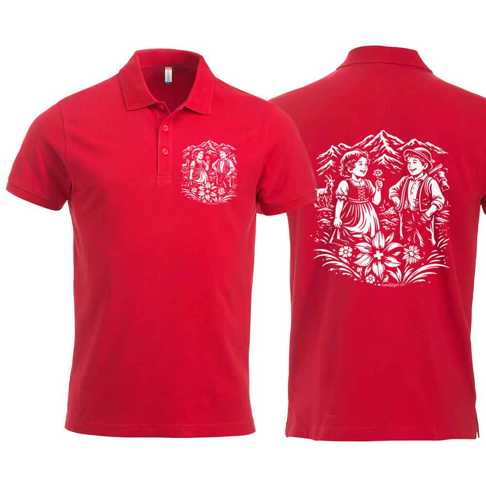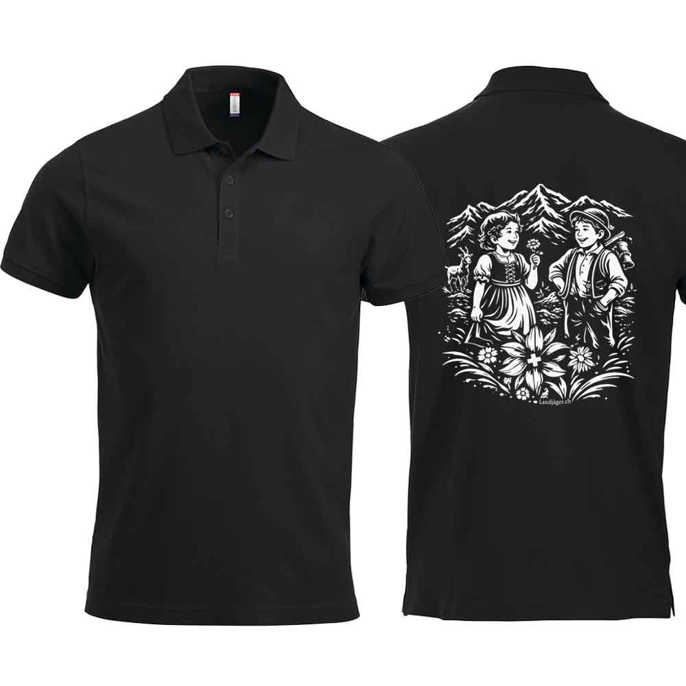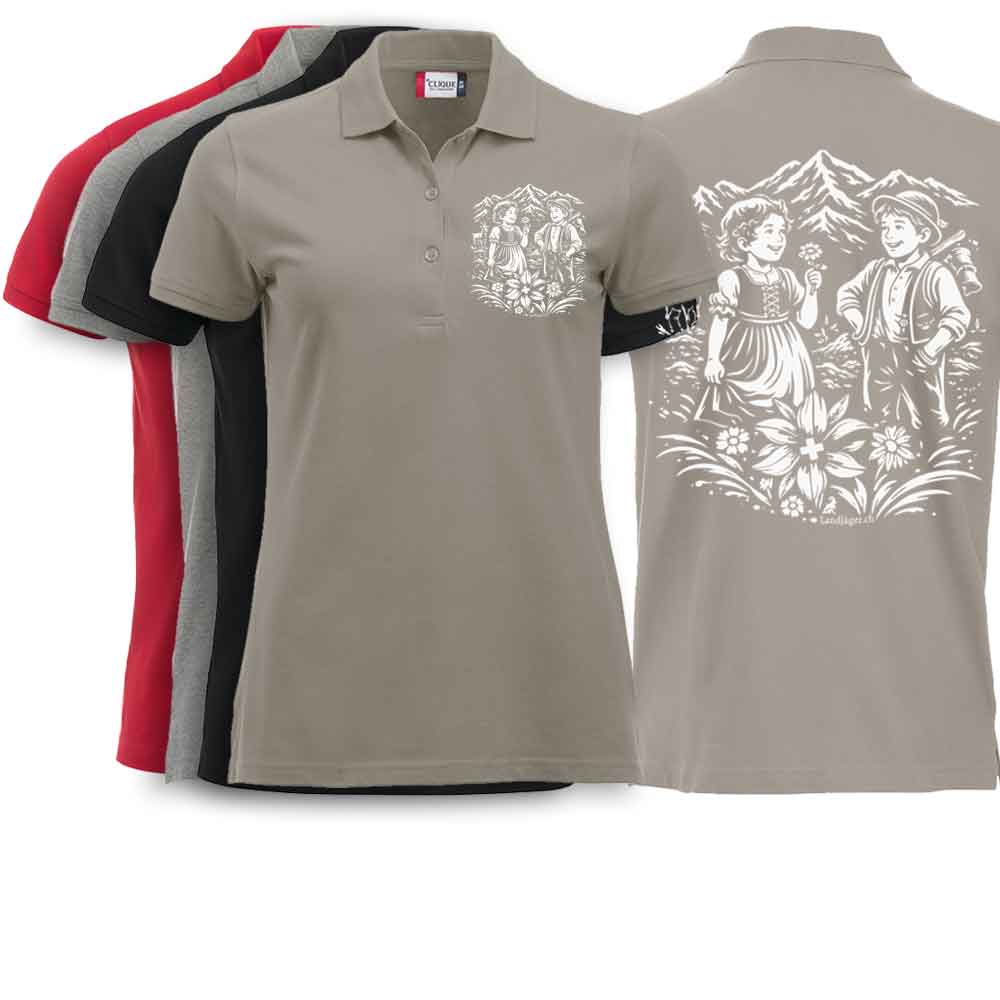 Polo femme greffé avec Heidi & Peter au look suisse, fier et magnifique. Disponible exclusivement ici.