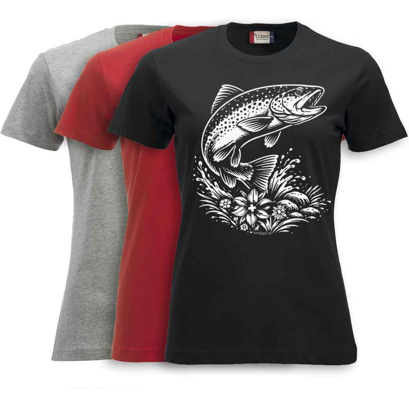 T-shirt pour femmes ennobli avec poisson (truite) dans le look Swissness, fier et magnifique.