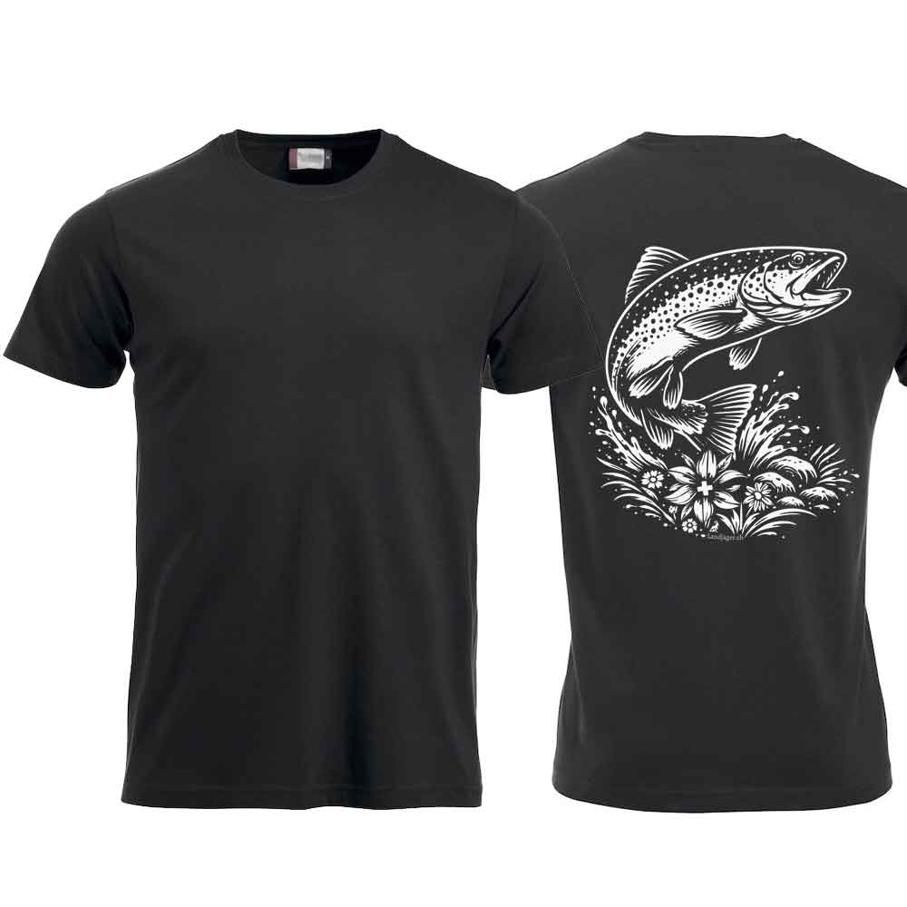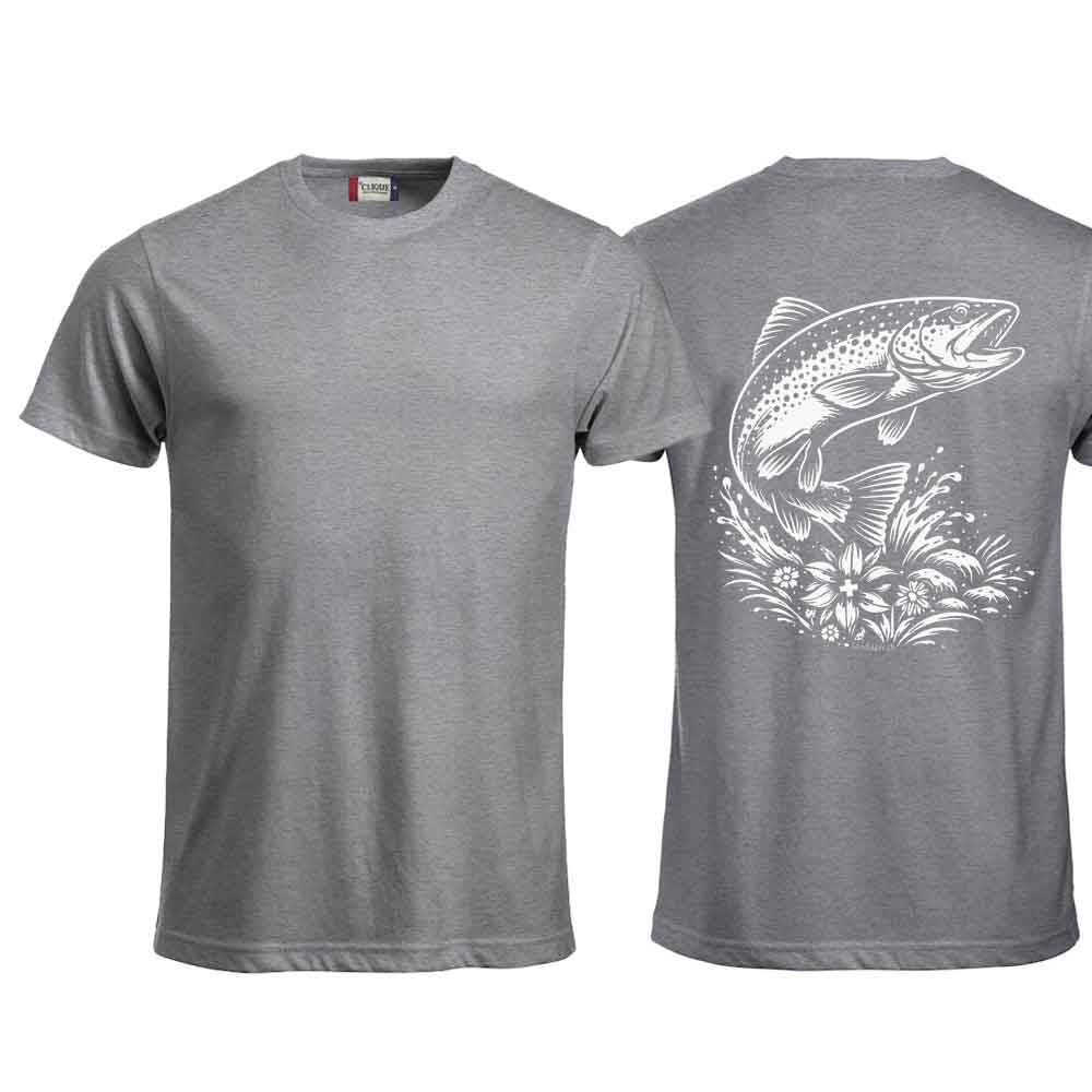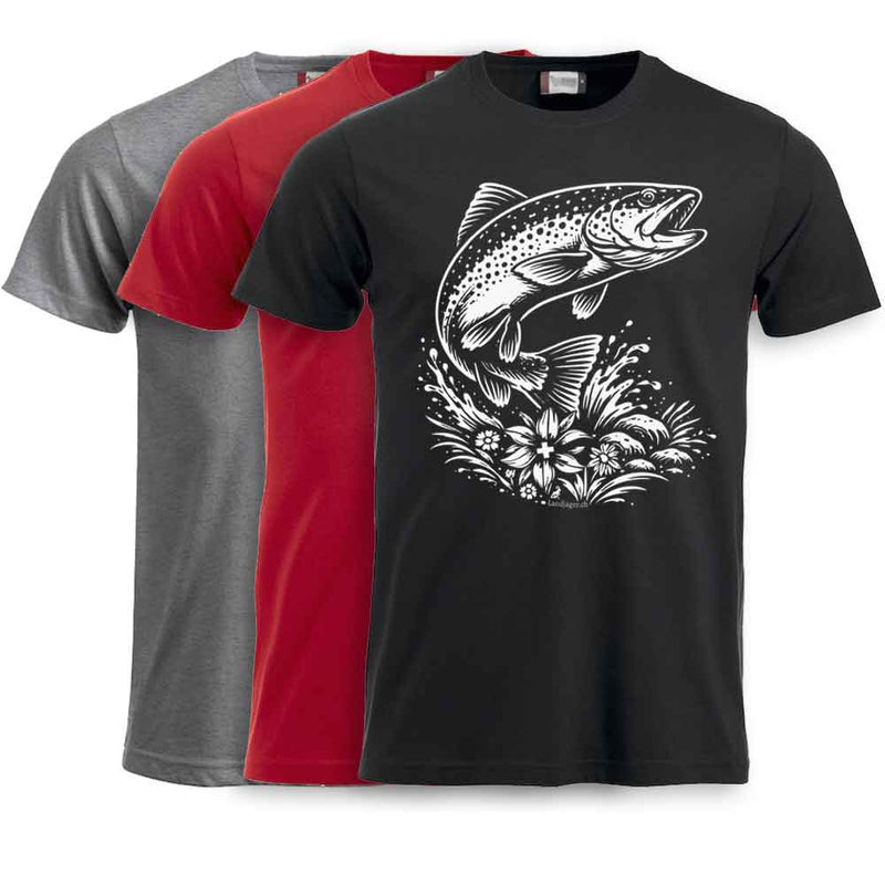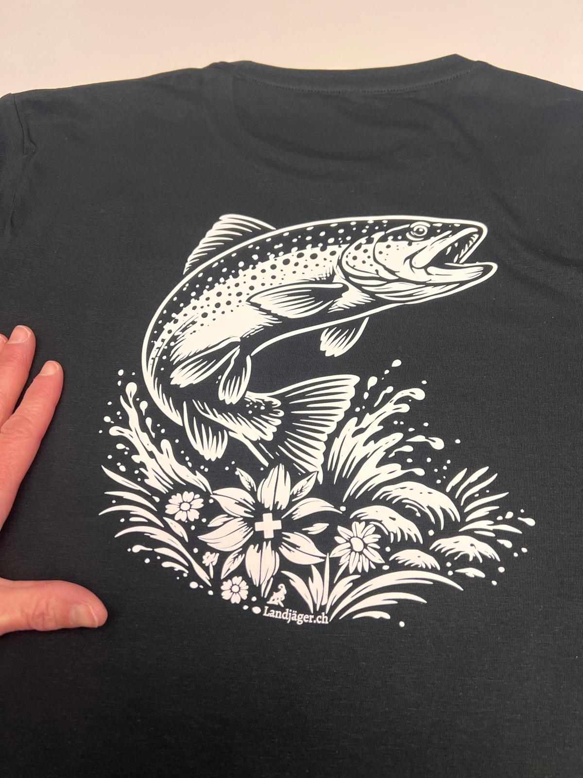 T-Shirt veredelt mit einem Fisch (Forelle) im Swissnesslook, stolz und prächtig. Exklusiv hier erhältlich.