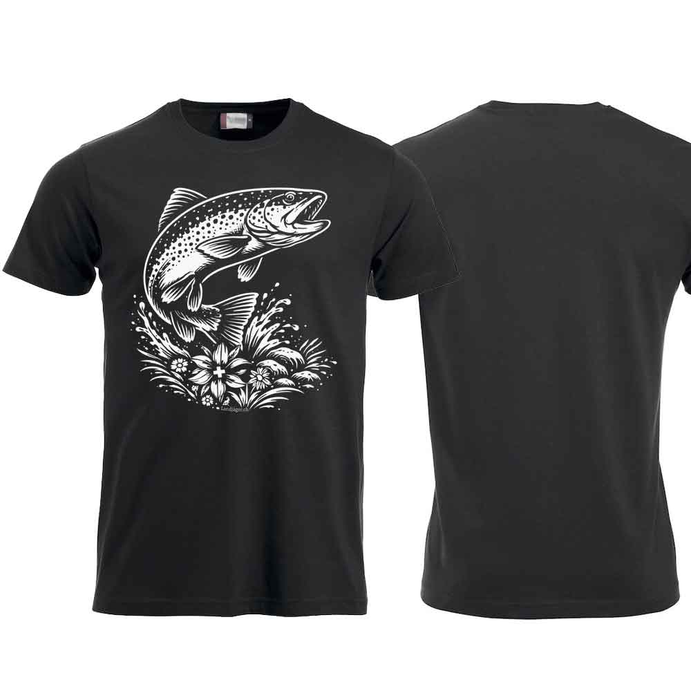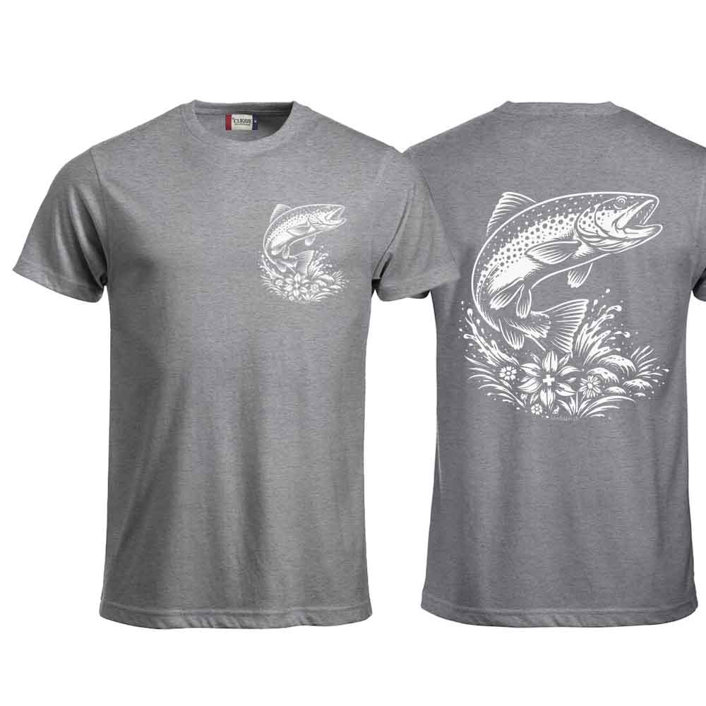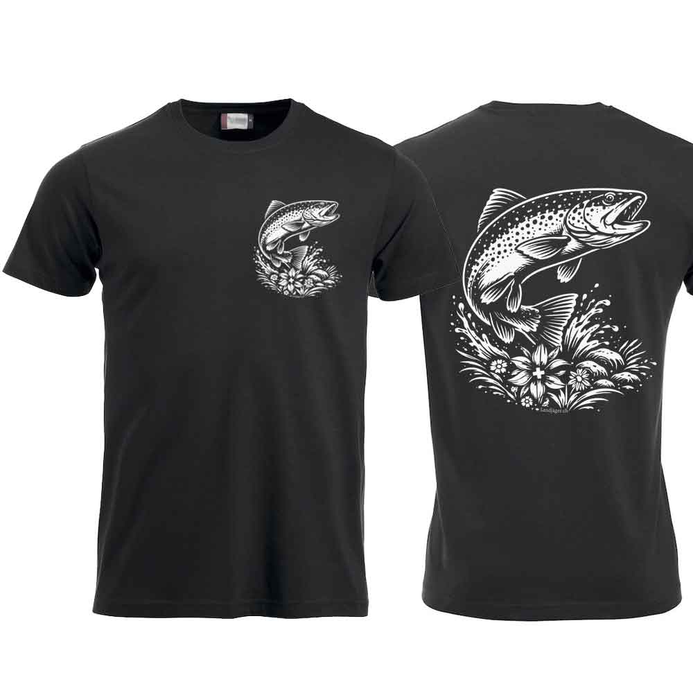 T-Shirt veredelt mit einem Fisch (Forelle) im Swissnesslook, stolz und prächtig. Exklusiv hier erhältlich.
